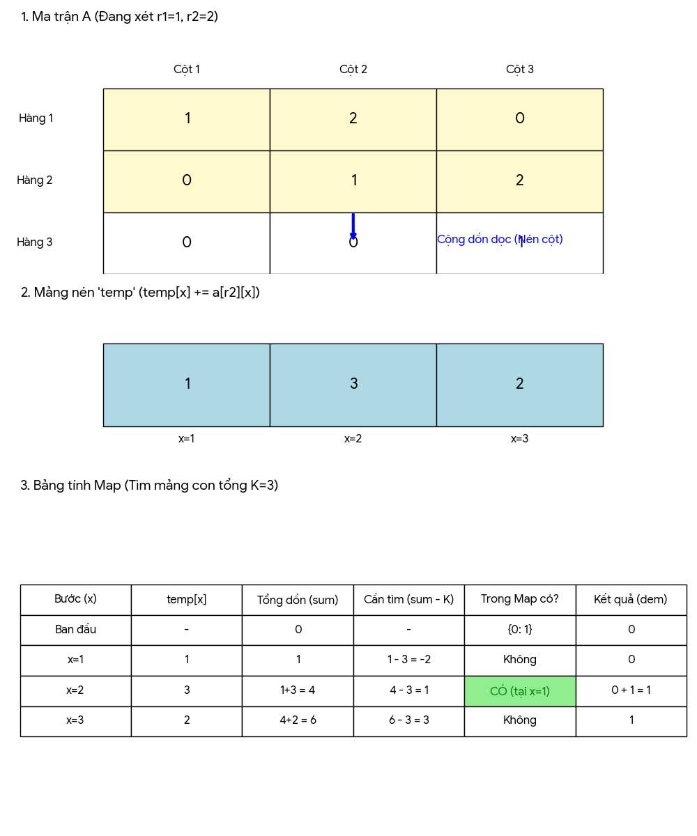 Cho một ma trận A kích thước N × M gồm các số nguyên không âm. Hãy đếm số lượng hình chữ nhật con (submatrix) có tổng các phần tử đúng bằng K.