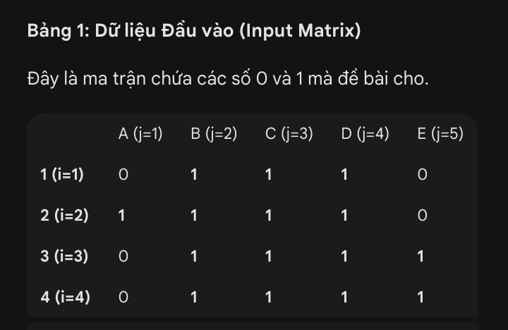• N dòng tiếp theo: Mỗi dòng chứa M số nguyên (chỉ 0 hoặc 1) biểu diễn ma trận A.