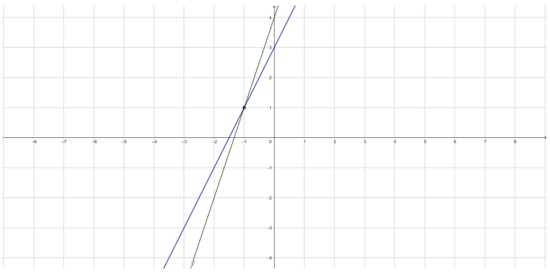 Giải thích: Xem hình bên dưới với đường màu xanh nước biển là đường thẳng (D) : y = 2x + 3, đường màu xanh lá cây là đường thẳng (A) : y' = 3x + 4.